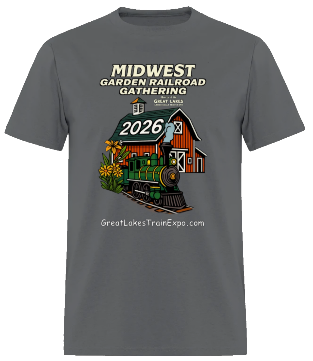 The 2026 Midwest Garden Railroad Gathering Official T-Shirt is a 100% cotton Gildan® Short Sleeve Soft Style T-Shirt that is soft and comfortable with a tear-away tag.